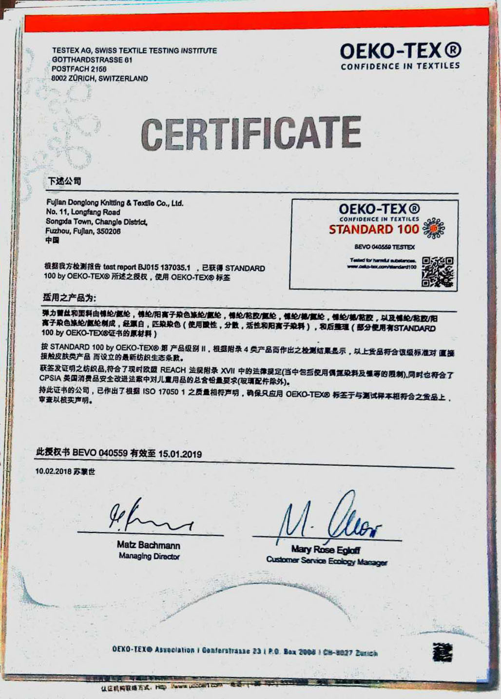 瑞士OEKO-TEX STANDARD 100生態(tài)紡織品認(rèn)證證書/2018-09-04